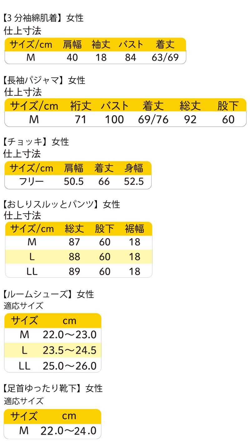 ●スルッとパンツ、ルームシューズはM〜LLの中から選択できます